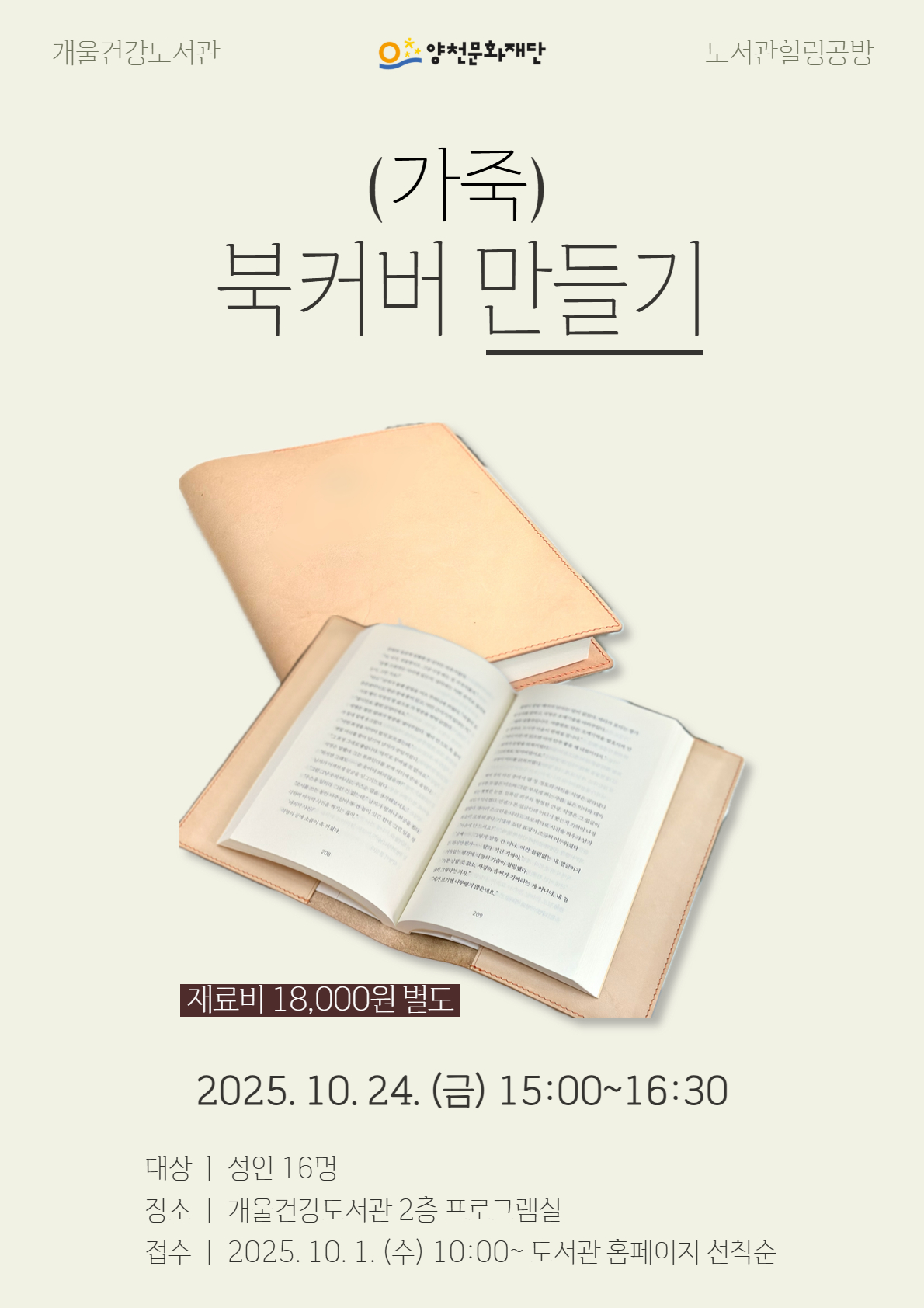 유의사항 안내 재료비 18,000원 별도 (28,000원 상당 가죽 북커버, 도서관에서 1만원 지원) 환불 불가, 신청자에 한해 개별 납부 안내 드립니다