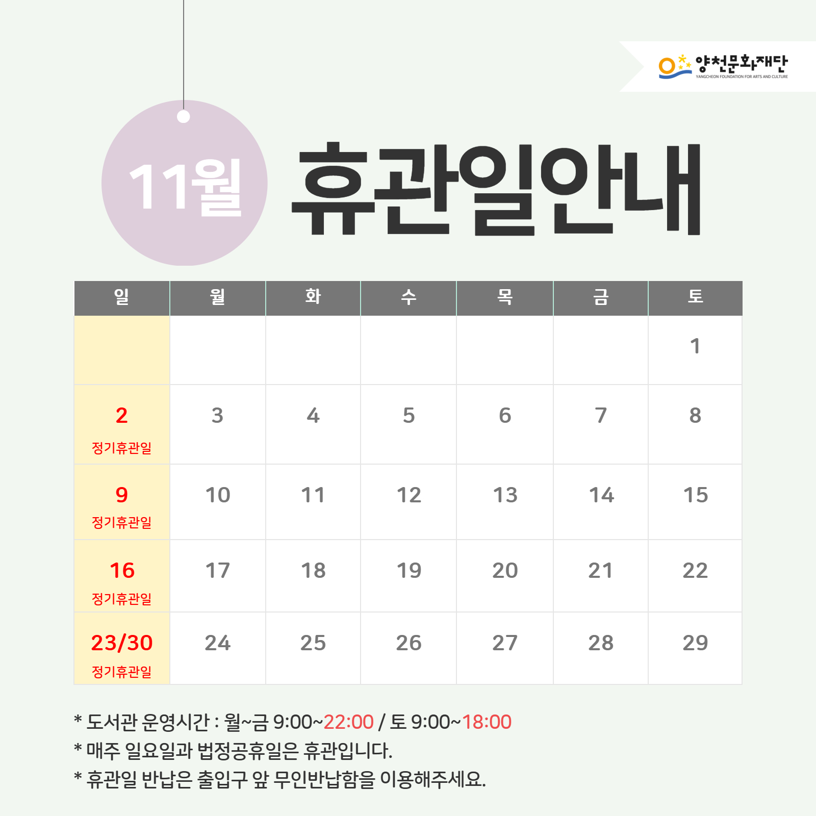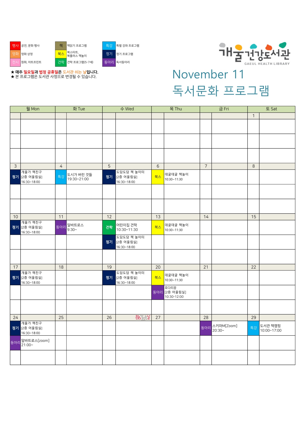 [개울건강도서관] 11월 휴관일 안내 및 독서문화프로그램 달력