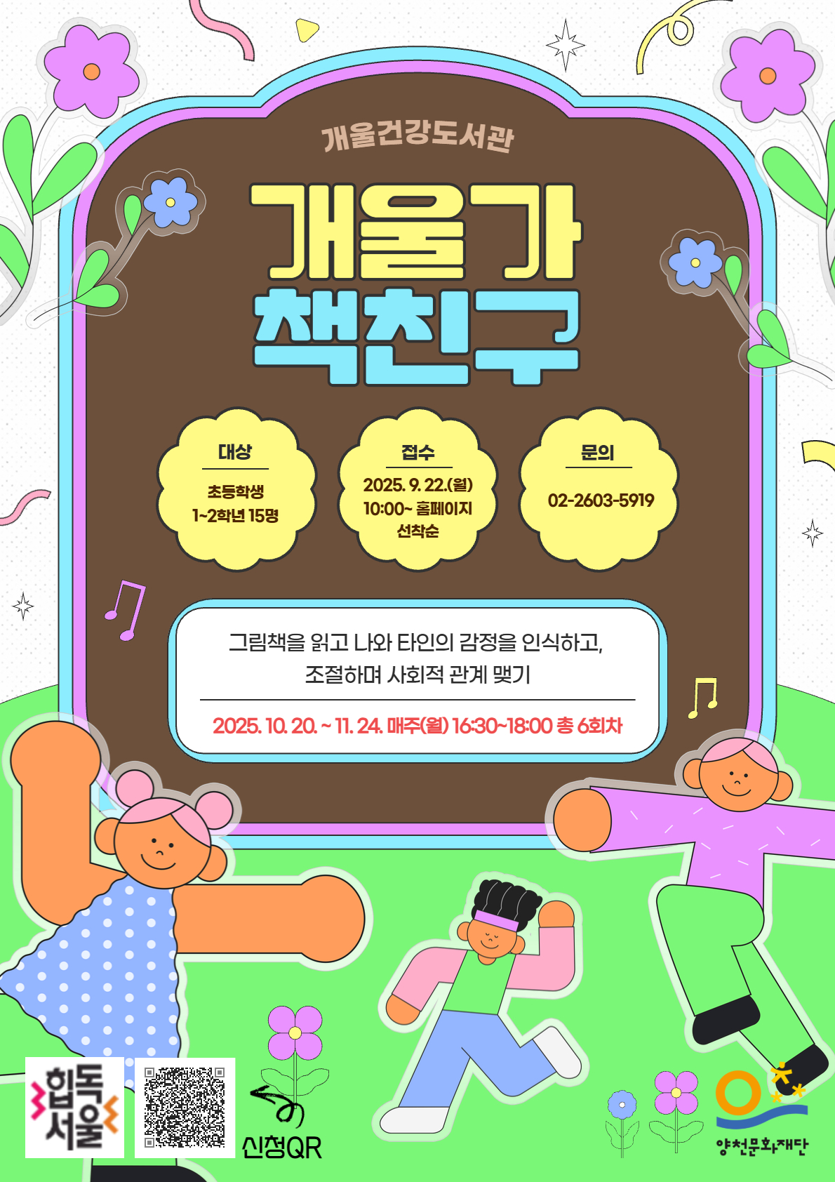 - 대상에 맞지 않을 경우 신청이 취소 됩니다.(2017, 2018년생 신청 가능) - 대기접수자의 경우 취소자 발생 시 접수 순에 따라 개별연락 드립니다. - 프로그램 신청은 참여자 본인 이름으로 가능합니다. (자녀가 참여자일 경우 자녀 명의로 회원가입 후 신청 가능 - 해당 프로그램의 참여 신청 후 프로그램 시작 2일 이전 취소자, 연락 없이 불참, 2회 이상 결석자의 경우 향후 양천구립도서관의 프로그램 신청에 제한이 있을 수 있습니다. - 프로그램 신청 시, 거주지는 세부 주소 없이 "동"만을 표기 부탁드립니다. 예) 신정3동