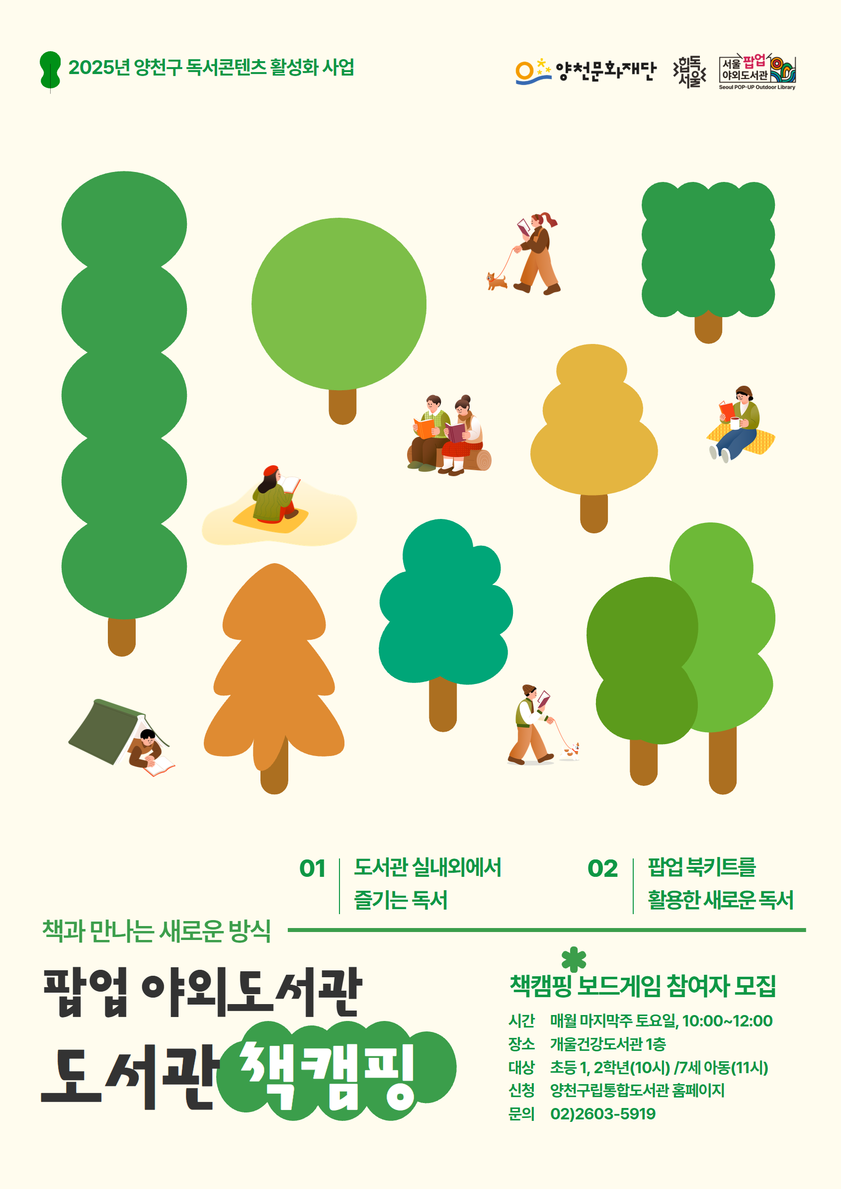 1. 보드게임 활용 독서존 운영_이야기뜰/10:00~17:00 2. 팝업 북키트 외부 대여/10:00~17:00, 회원증 소지자 3. 책캠핑 연계 보드게임 프로그램(7세/초등 1학년)