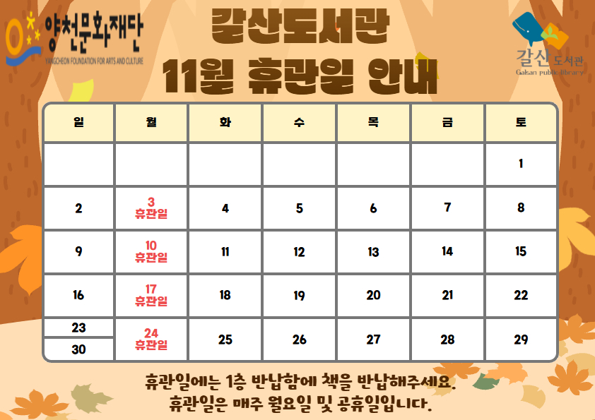 [갈산도서관] 11월 휴관일 안내