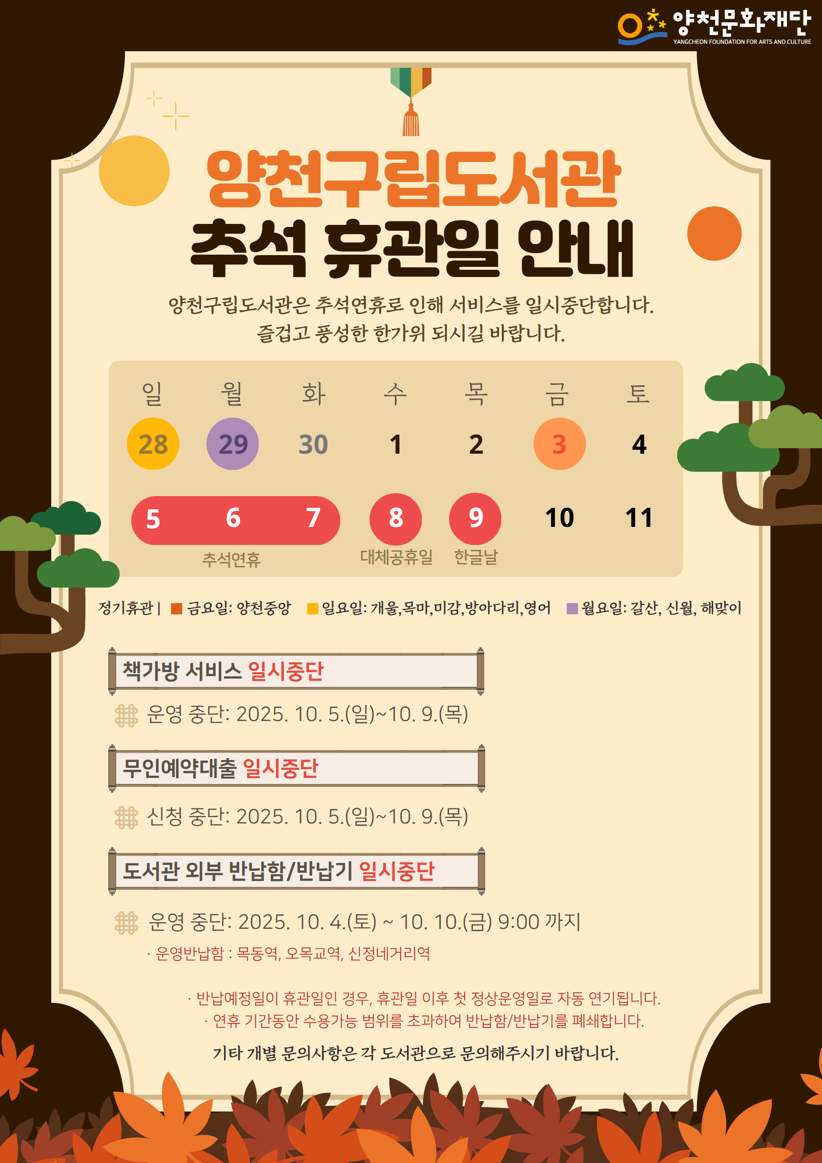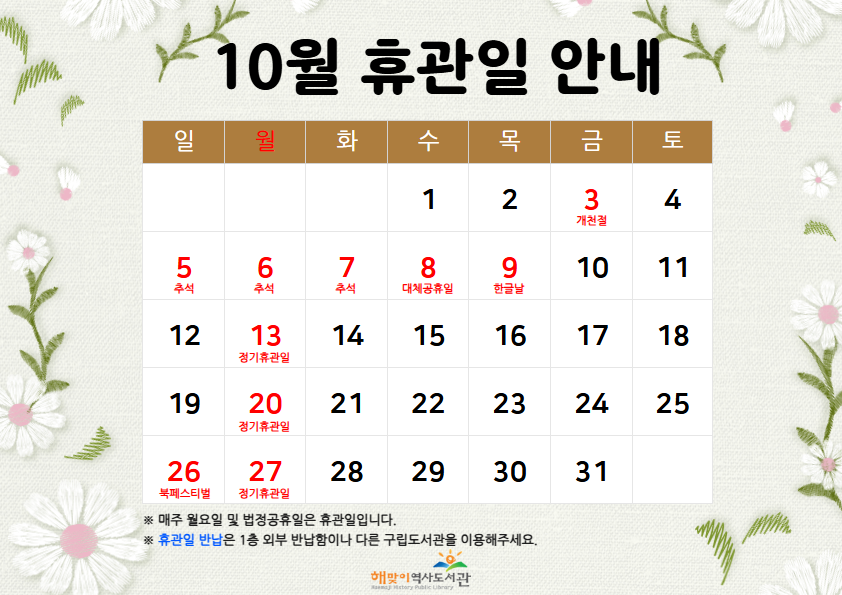 [해맞이역사] 10월 휴관일 안내 및 추석 연휴기간 운영 안내