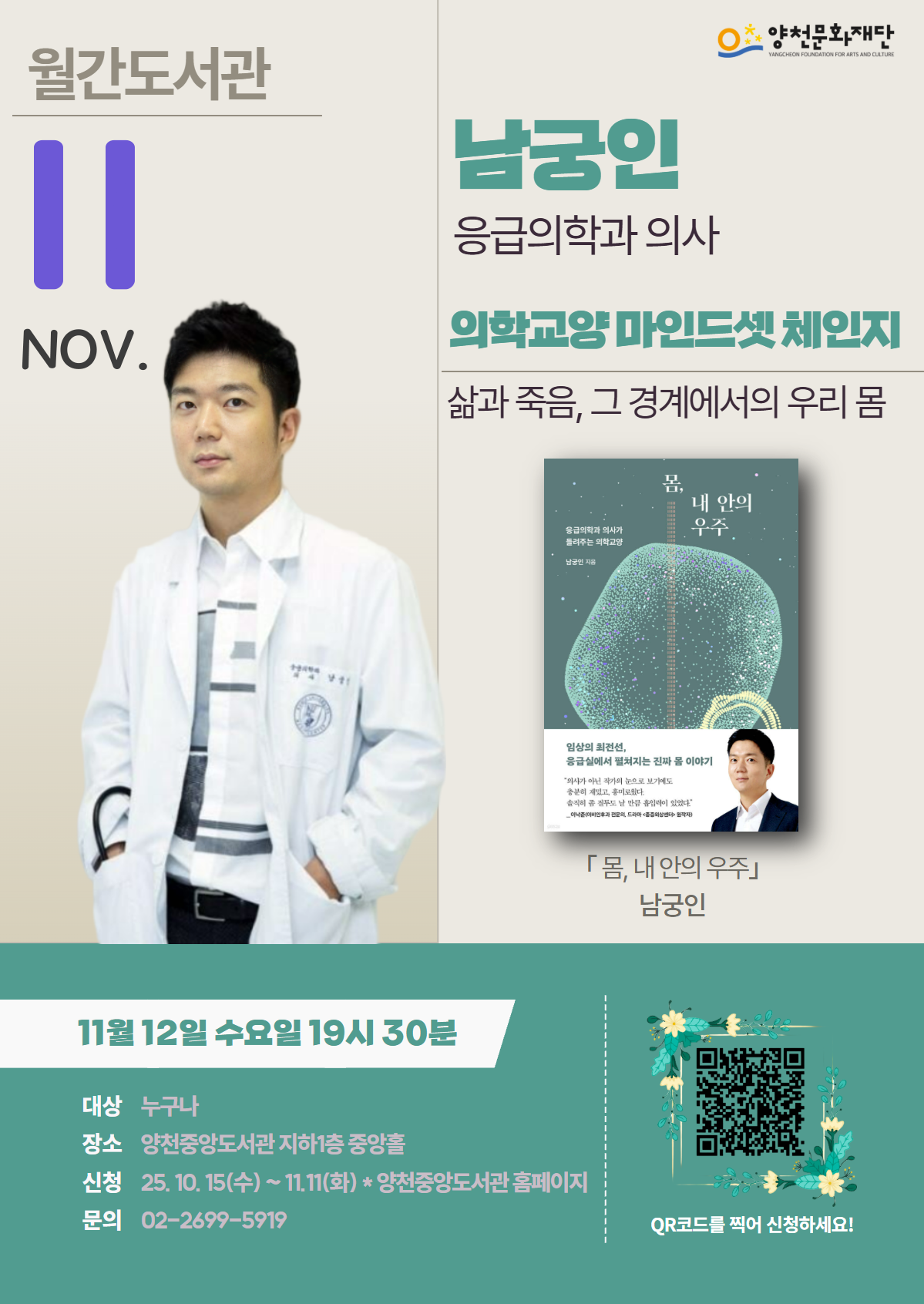 이번 월간도서관 11월 강연은 <몸, 내 안의 우주>의 저자이자 베스트셀러 작가이시며, 이대목동병원에서 현 응급의학과 의사로 재직중이신 남궁인 작가님을 모셨습니다.