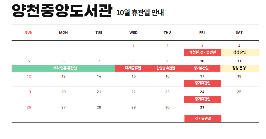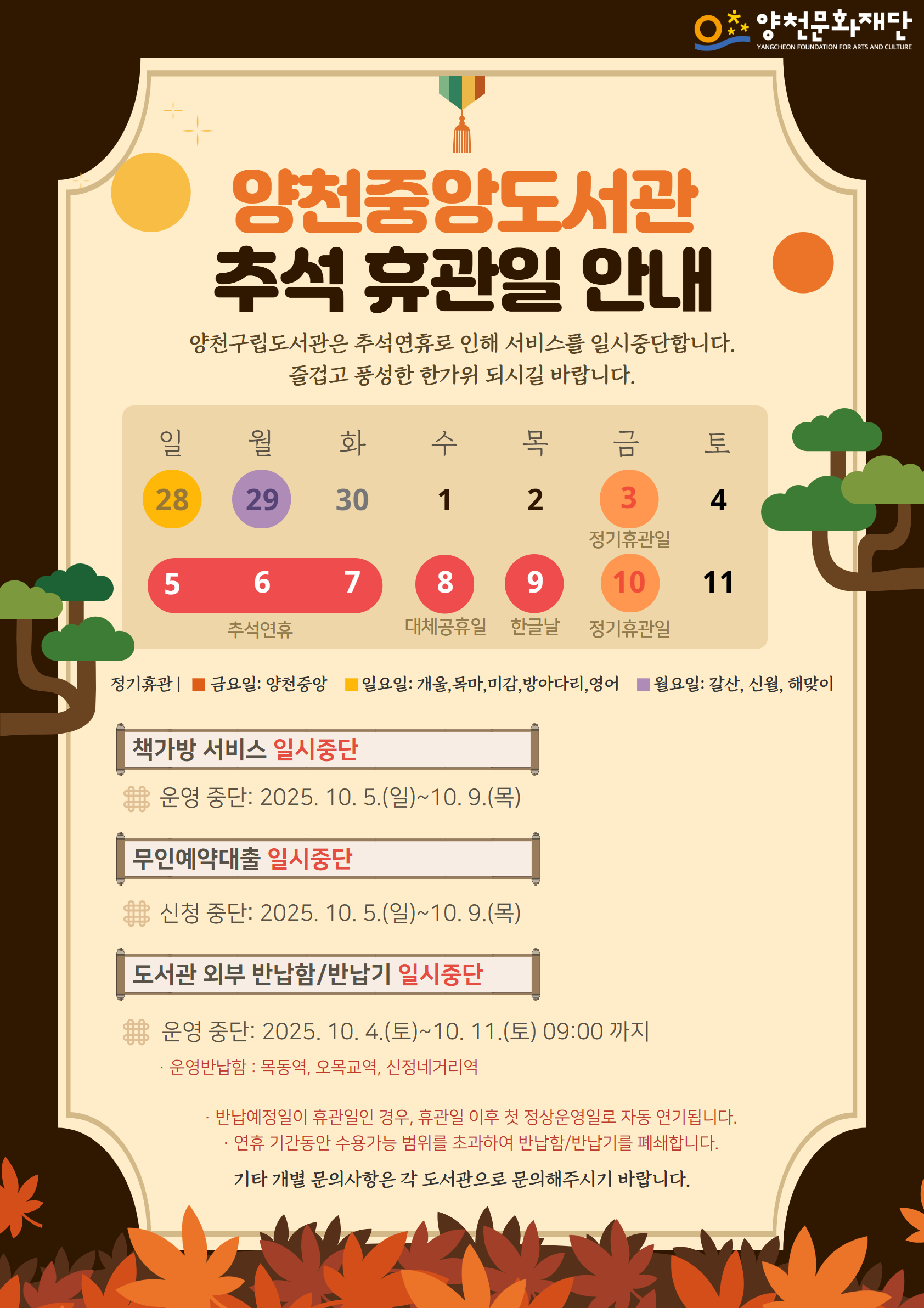 [양천중앙도서관] 10월 휴관일 및 추석연휴기간 운영안내